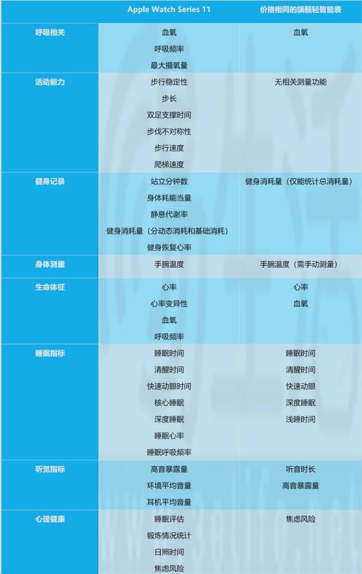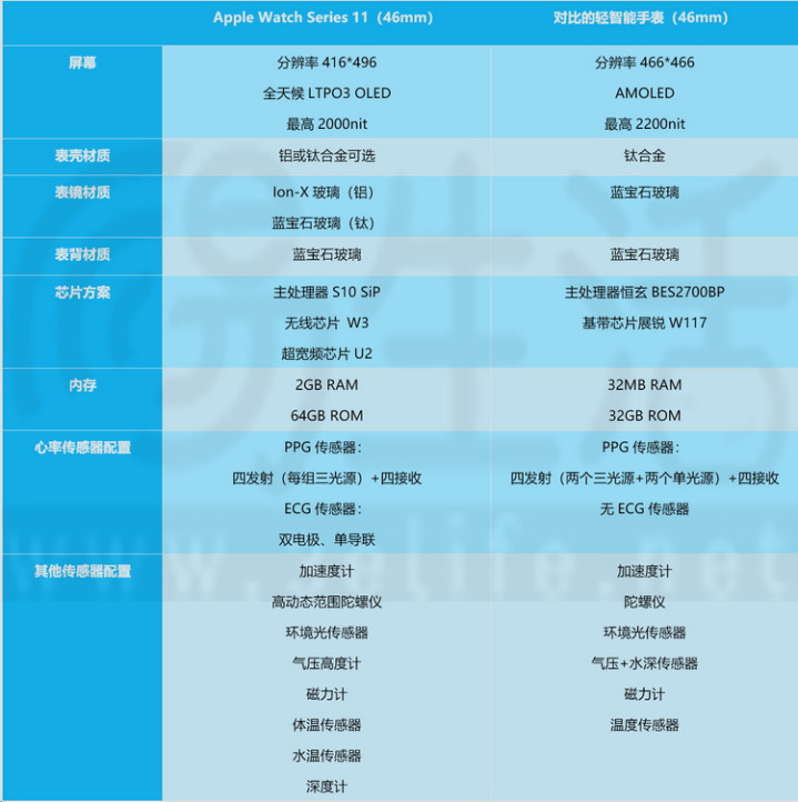 首先,我们还是用一张表格来对比这两款产品的配置。可以看到,在相同价位的前提下,以Apple Watch Series 11为代表的全智能手表,似乎在健康监测相关传感器的细节用料上还是会更好些。