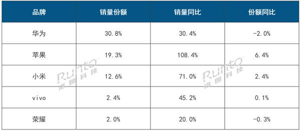 vivo和荣耀分别以2.4%、2.0%的销量份额排在第四、第五位。vivo销量同比增长45.2%,份额同比微增0.1%;荣耀销量同比增长20.0%,份额同比下降0.3%。